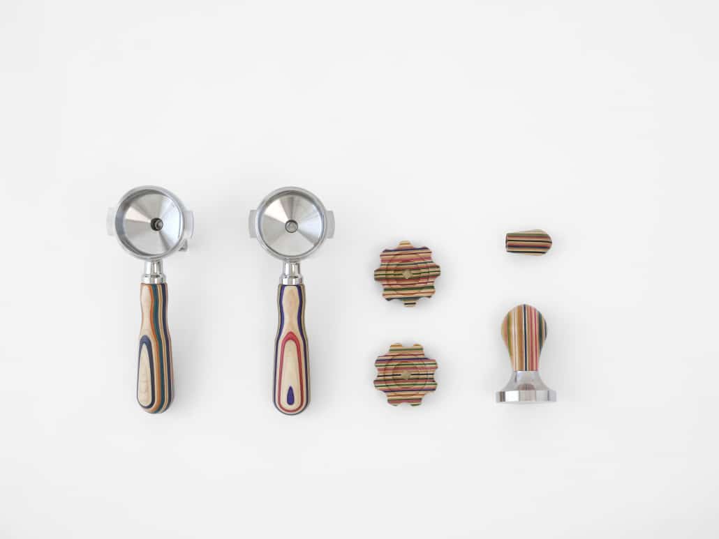 Hochwertiges Veredelungs-Set aus recycelten Skateboard-Decks für deine Espressomaschine. Jeder Griff und Knauf ist ein farbenfrohes Unikat aus mehrfach verleimtem Ahornholz —nachhaltig, robust und ein echtes Design-Statement.